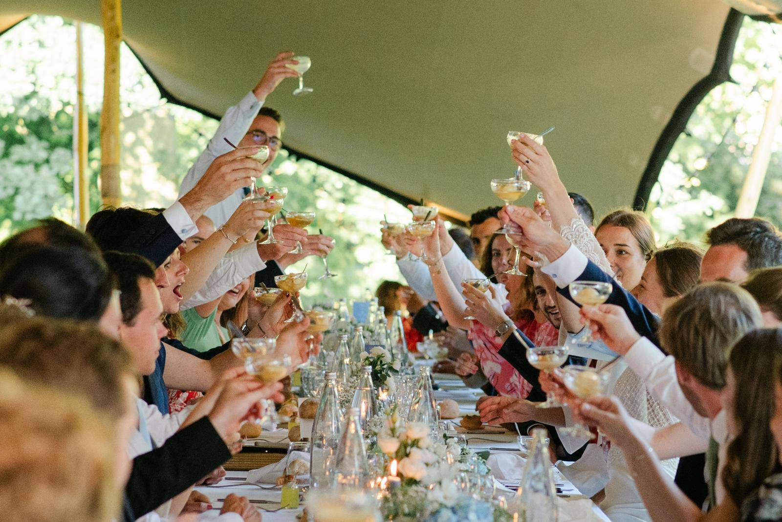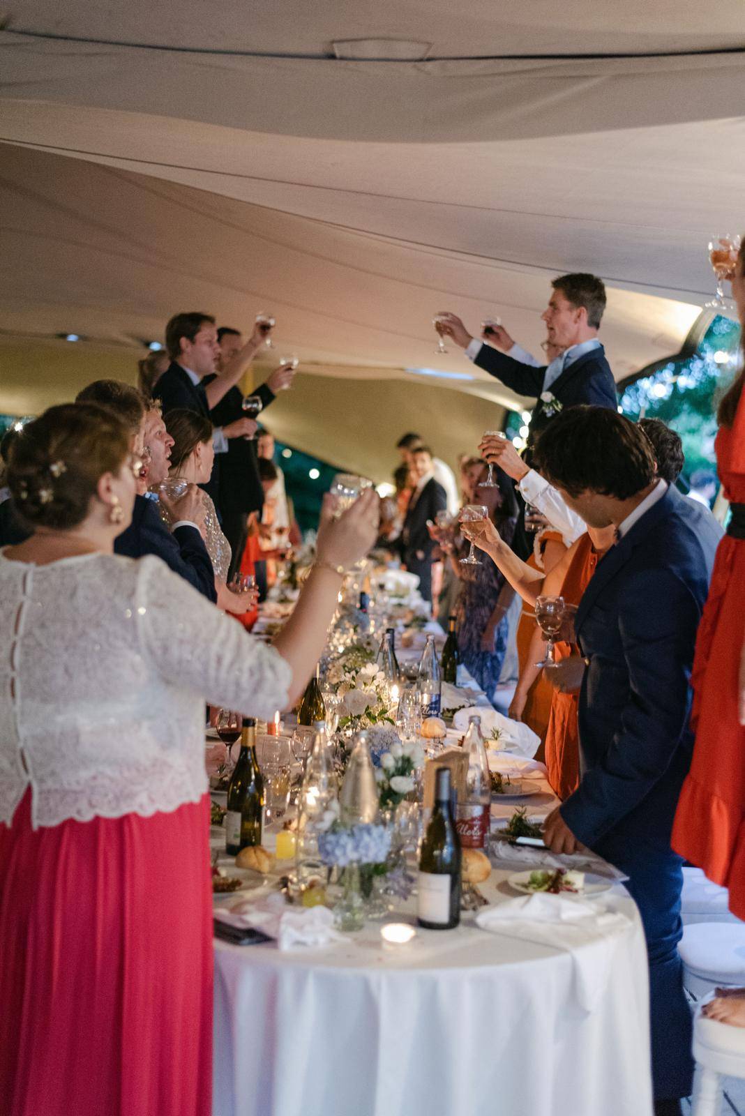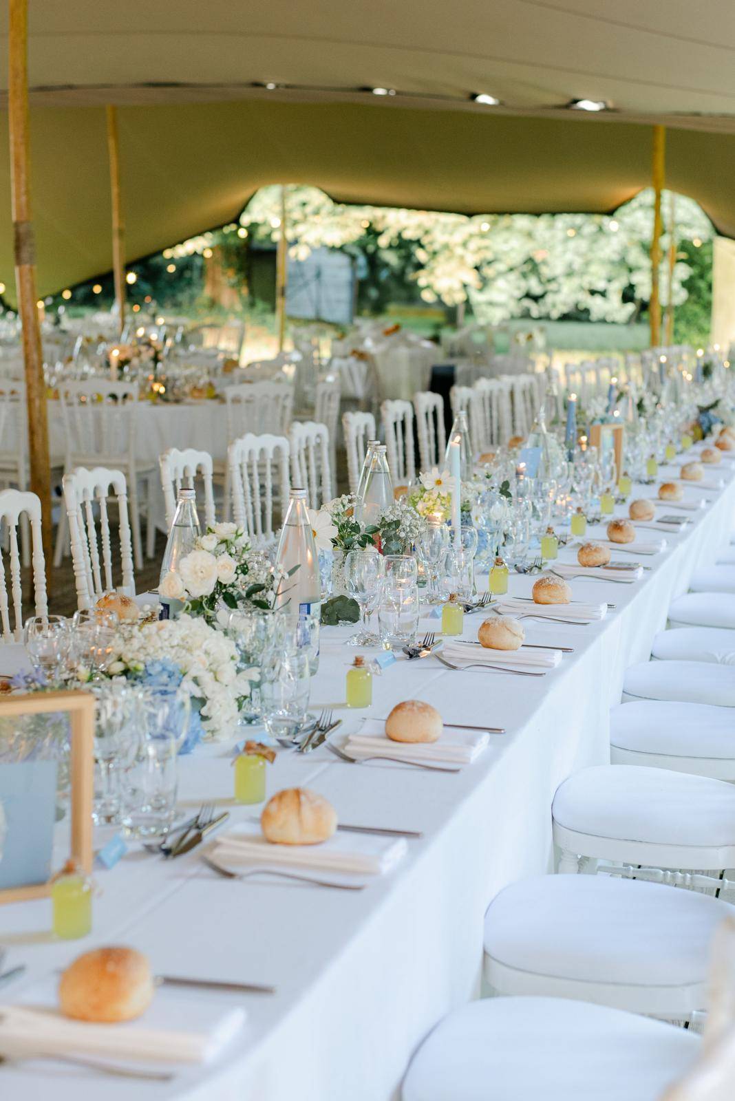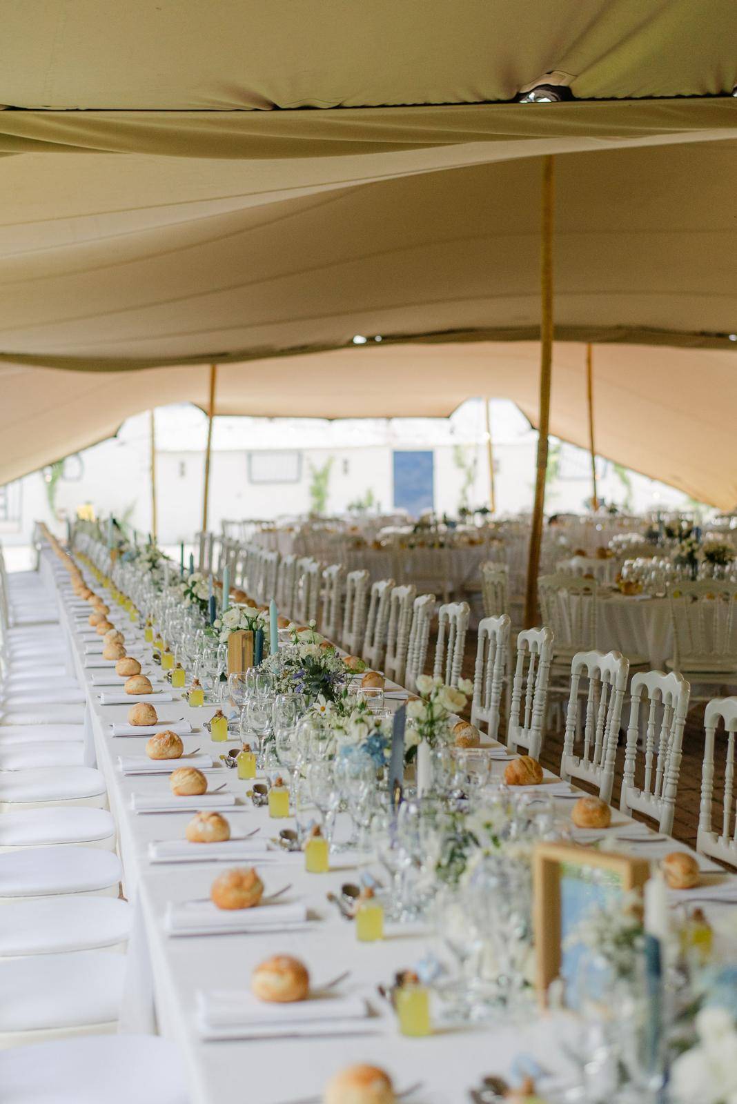 C’est dans les somptueux jardins du château qu’a été dressée une tente touareg majestueuse, ouverte sur la verdure et offrant une vue imprenable sur la silhouette élégante du château. Ce choix original et audacieux a permis de créer un espace de réception à la fois chaleureux et spectaculaire, en parfaite harmonie avec la nature environnante.
